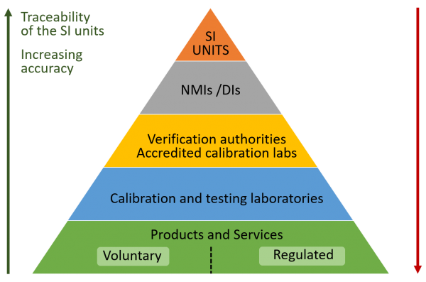 The chain of traceability ultimately leads to the realisations of the International System of Units (SI). This image shows the hierarchy for how measurement standards are disseminated in an economy from the SI.